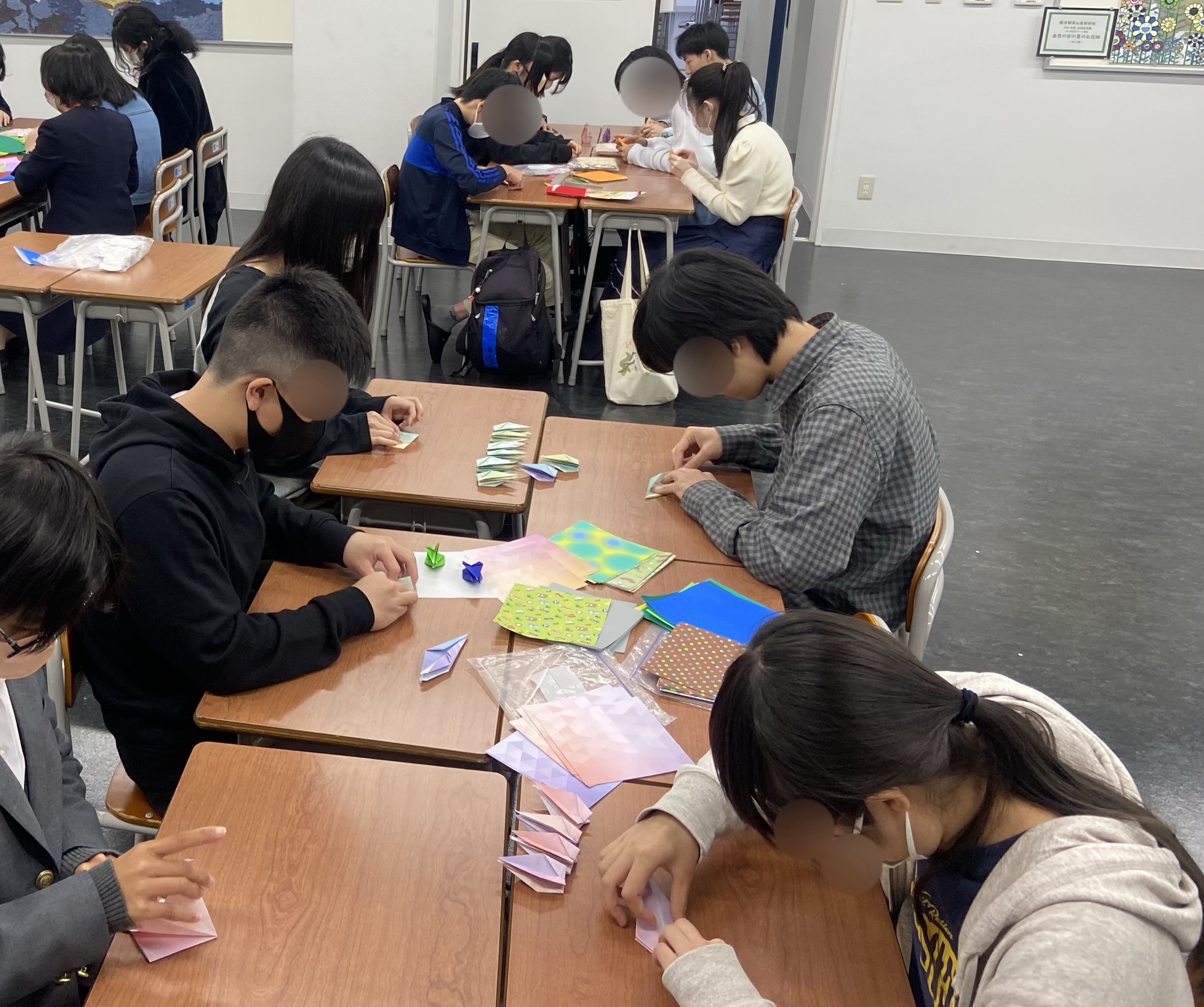 2限目の千羽鶴作りではグループに分かれ、学年の枠を超えて活動しました。 作り方をわかる人が教えてくれて、みんなで今回は100羽ほど折ることができました。 友達作りをしたい方も是非参加してみてください。 千羽作りたいと思いますので、皆さんのご協力をお願いします。