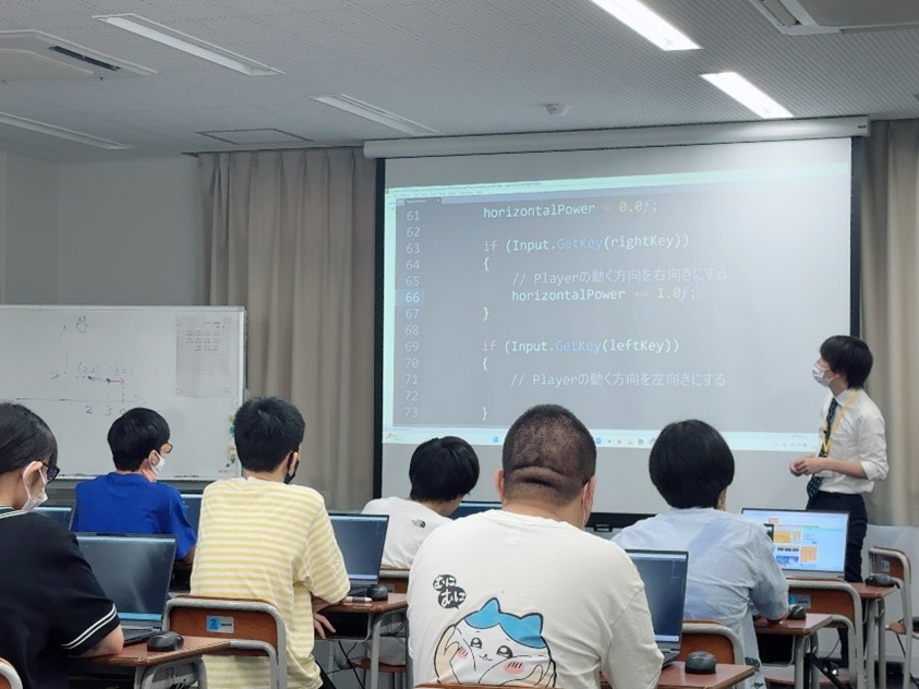今回は、ゲーム内のキャラクターを左右に動かすプログラムを作成しました。自分の書いたコードでキャラクターが動く様子を見ると、思わず「おおー!」と声があがるほど盛り上がりました。