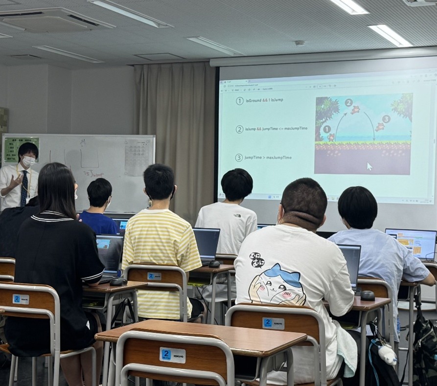 ジャンプの動きには、「論理演算子」や「真偽値(true / false)」といった少し難しい考え方も出てきましたが、みんな真剣な表情で取り組んでいました。